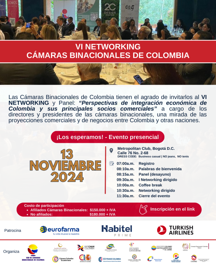 Las cámaras Binacionales de Colombia tienen el agrado de invitarlos al VI Networking y Panel “Perspectivas de integración económica de Colombia y sus principales socios comerciales” a cargo de los directores y presidentes de las cámaras binacionales, una mirada de las proyecciones comerciales y de negocios entre Colombia y otras naciones.